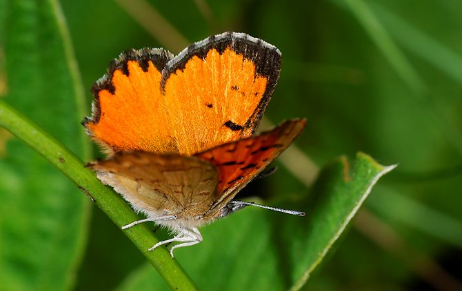 Or, the brilliant Mooi River Opal, Chrysoritis lycegenes, whose caterpillars feed on plants but shelter inside ants' nests.