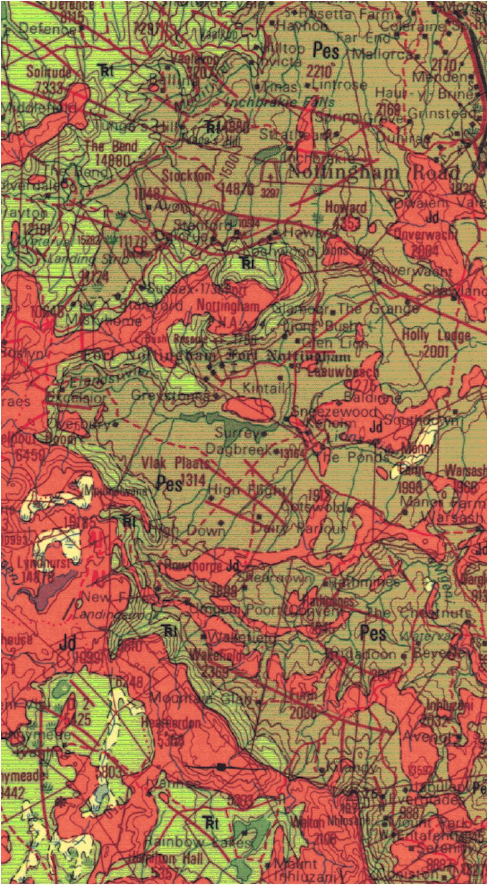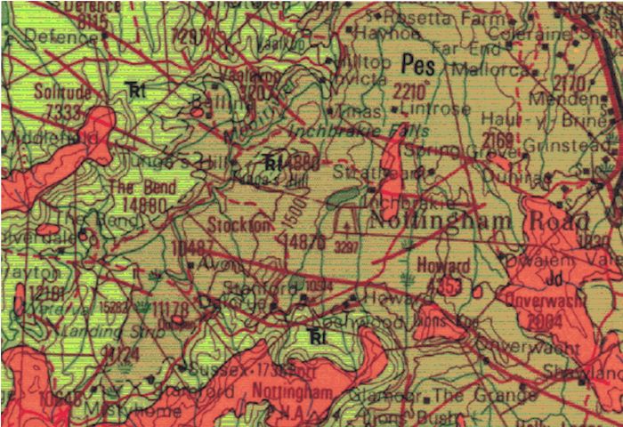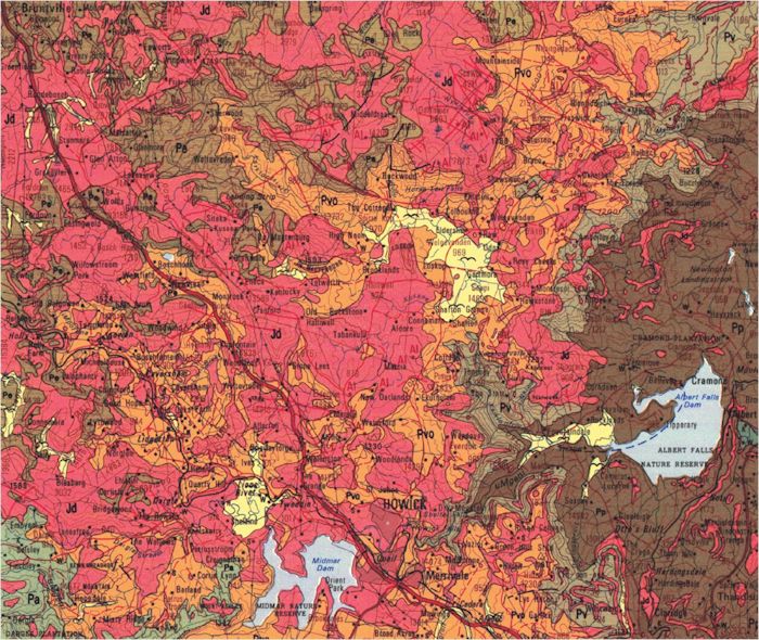 On the maps below, the Ecca Shale groups (Vryheid, Pietermaritzburg, Volksrust and Escourt) are marked Pv, Pp, Pvo and Pes respectively. Shale is shown as the browny colour. The pink colour is dolorite. The Midlands has similar geology to that of the Karoo, and is intruded by dolerite – the dykes are shown as red lines on the map. The presence of Dolorite makes drilling more difficult and less profitable. The Berg area has very little shale and it is intersected by dolerite dykes. Nottingham Road has Escourt shale and swarms of dolerite.
